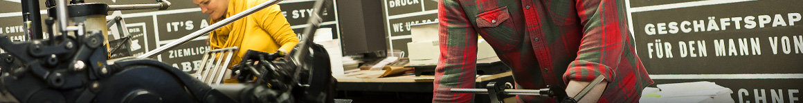 Unser Heidelberger Zylinder brachte gut 10.000 mal, ohne mit der Wimper zu zucken, etliche Tonnen Letterpress-Gewalt auf den Cover-Bogen, nachdem der Designer mit bloß einer Farbe in unverkennbarer Handschrift gestaltet hat. Das kompromisslose Pantone Violet macht den Job, die große Letterpress-Druckform wird von Letterjazz-Drucker Marco akkurat eingefärbt. Die flächigen Elemente brauchen satt Farbe, aber für den EAN-Code und die teils kleine, feine Typografie kann es rasch zu viel sein, eine Gratwanderung also.